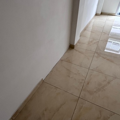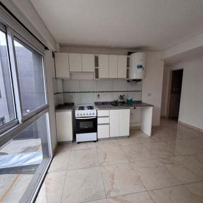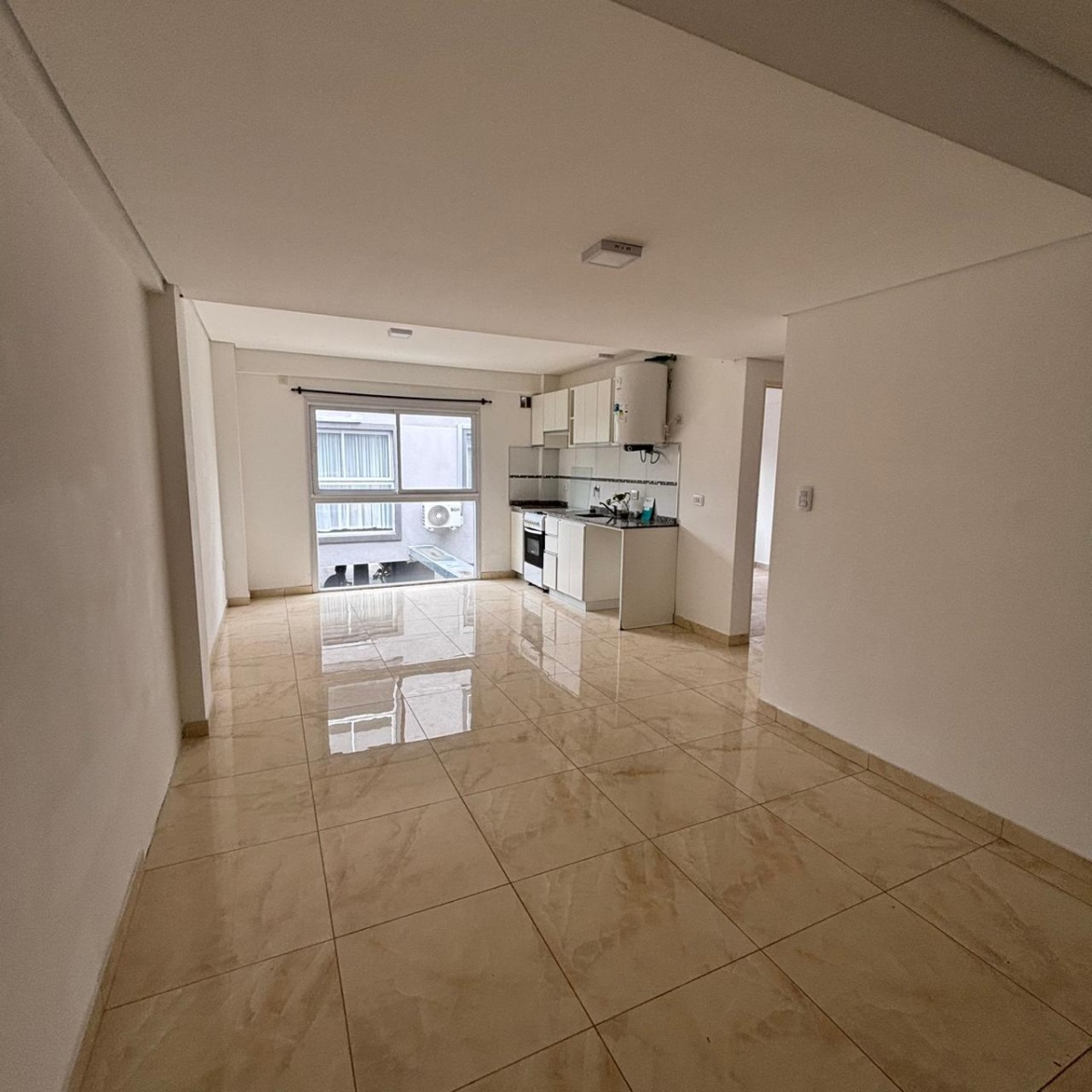 Cocina con alto y bajo mesada, living comedor con porcelanatos color beige.
